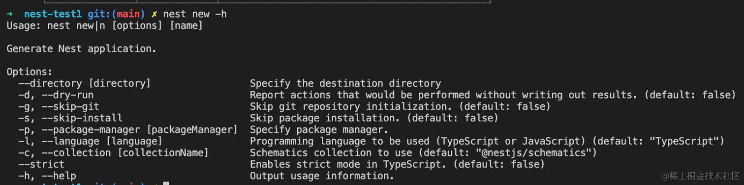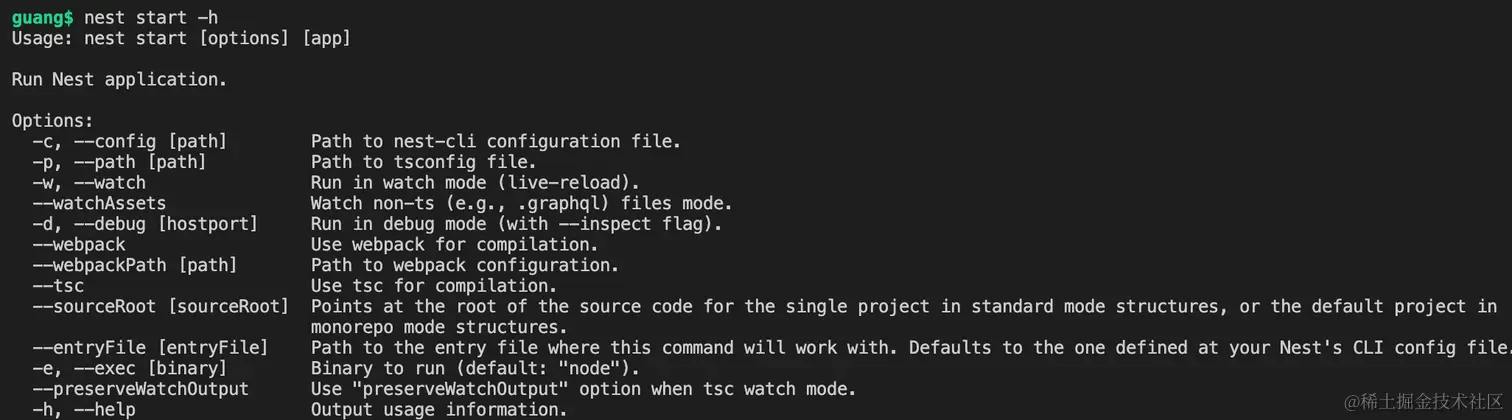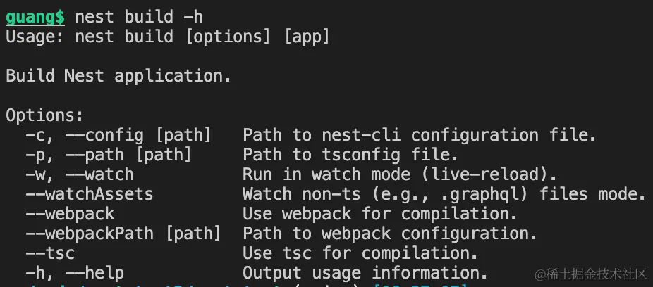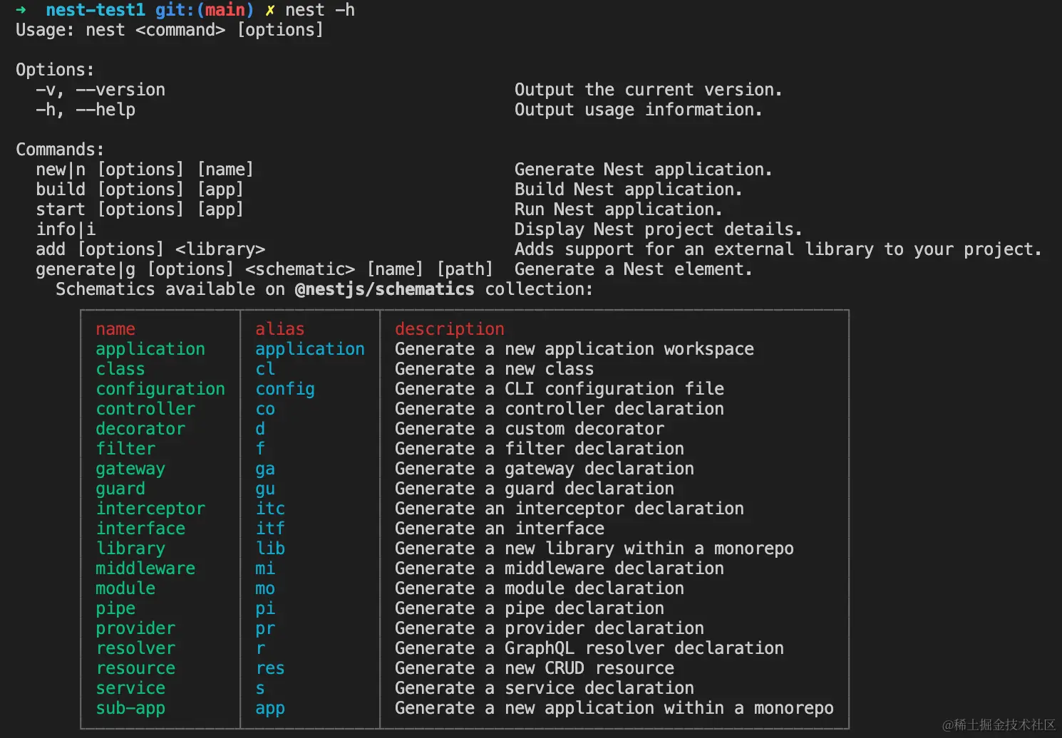 有创建新项目的 nest new,有生成某些代码的 nest generate,还有编译构建的 nest build,开发模式的 nest start 等。