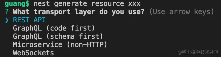它会让你选择是哪种代码,因为 nest 支持 http、websocket、graphql、tcp 等,这里我们选择 http 的 REST 风格 api: