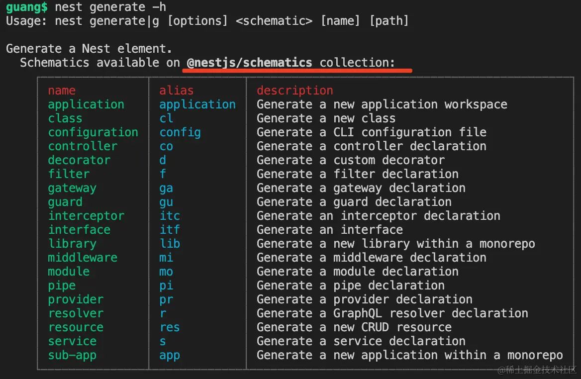 nest 命令除了可以生成整个项目外,还可以生成一些别的代码,比如 controller、service、module 等。