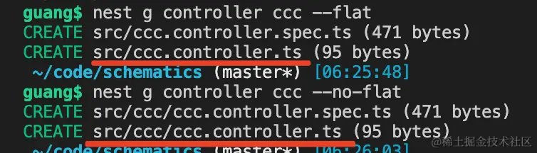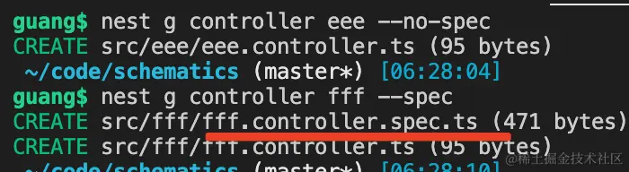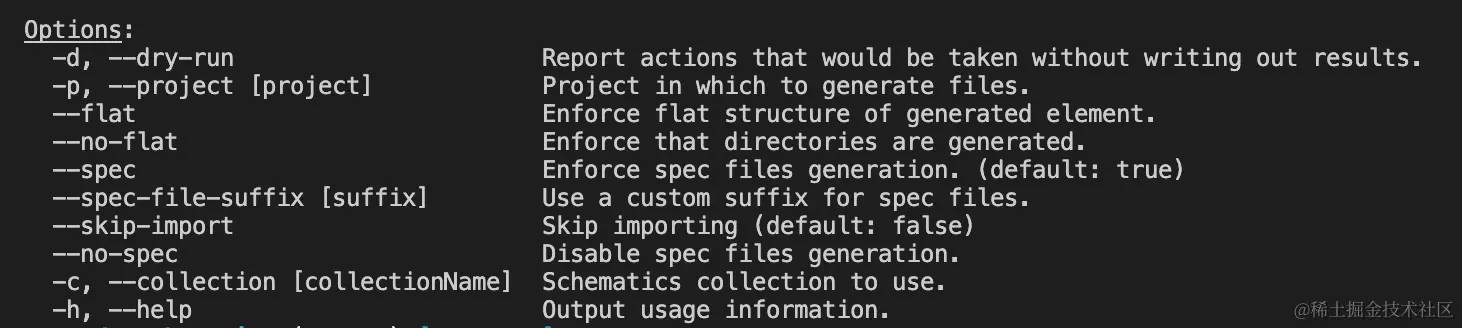 然后是 generateOptions,这些就和我们 nest generate 时的 –no-spec、–no-flat 一样的效果。