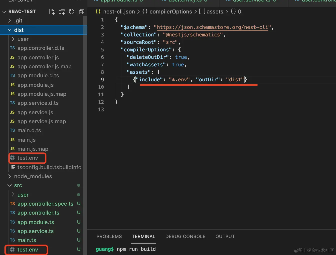 而 assets 是指定 nest build 的时候,把那些非 js、ts 文件也复制到 dist 目录下。