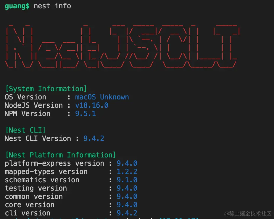 最后还有个 nest info 命令,这个就是查看项目信息的,包括系统信息、 node、npm 和依赖版本: